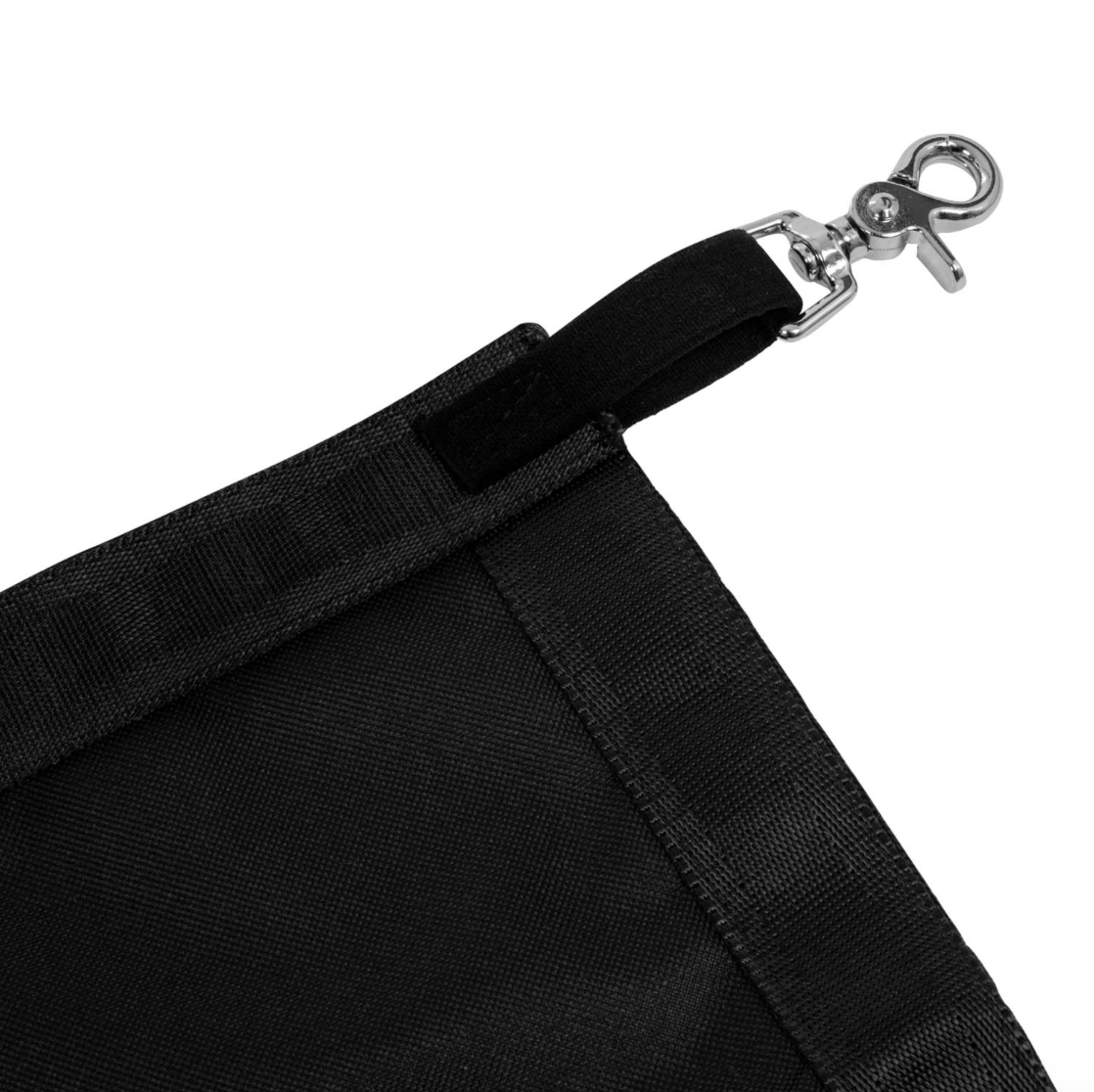 Dotato di quattro resistenti moschettoni in acciaio inox che permettono di  fissarlo facilmente alla porta del box.