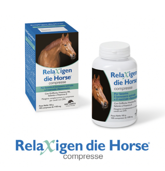 Relaxigen die Horse compresse è un mangime complementare per cavalli non DPA con griffonia, vitamina B6, selenio e vitamina E, formulato per favorire il normale benessere dell’animale ed il fisiologico rilassamento in occasione di competizioni, trasporto, attività sportiva ed alterate condizioni ambientali.