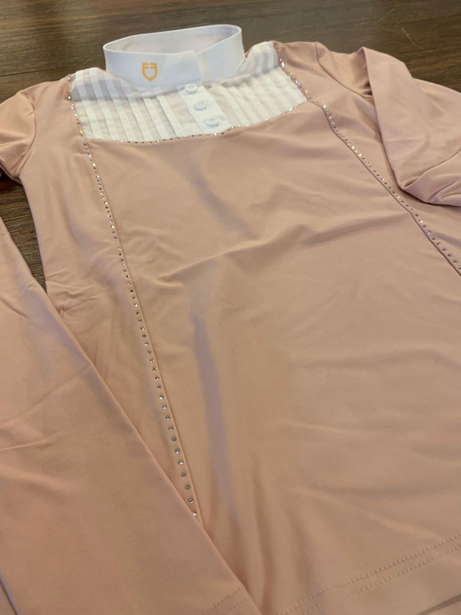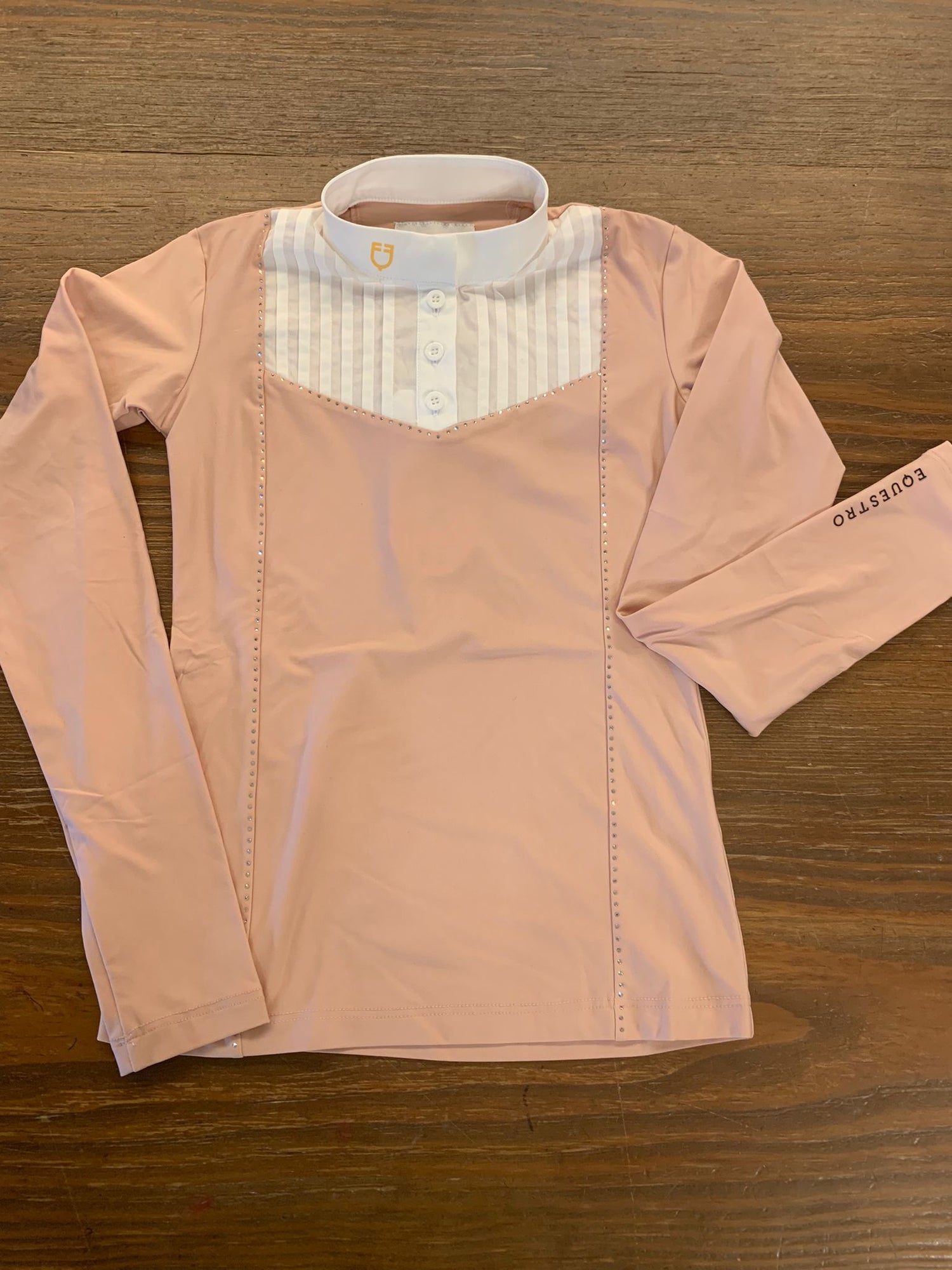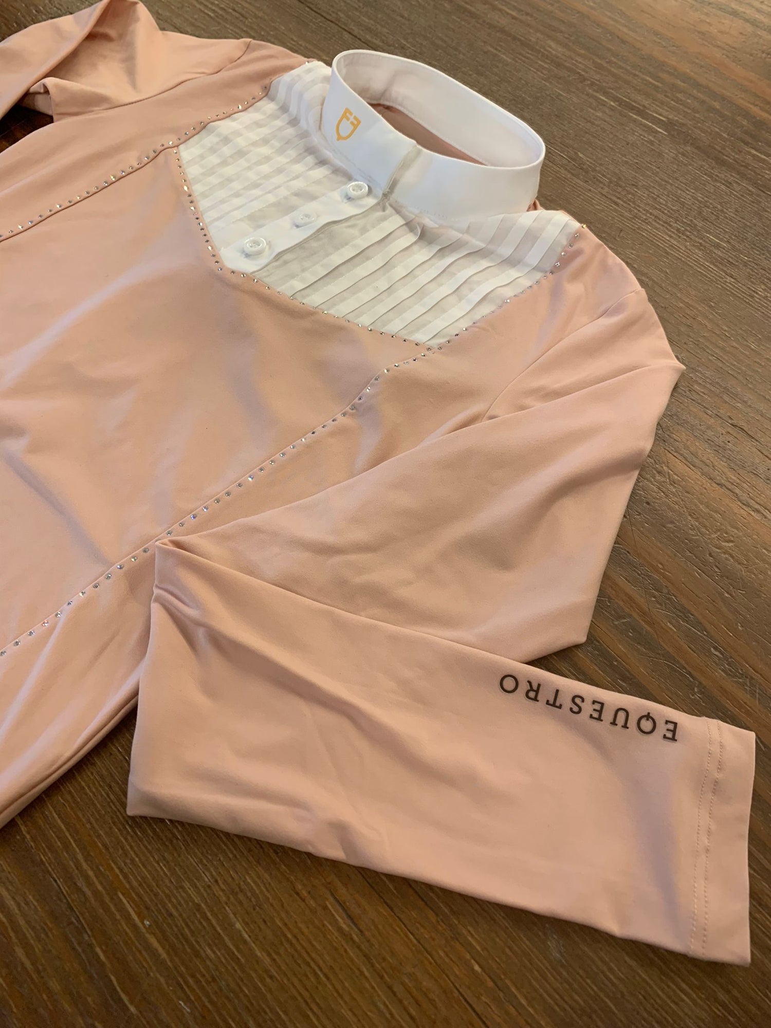 L'attenzione ai dettagli è ulteriormente enfatizzata dal logo Equestro posizionato con cura sul colletto e dagli inserti in strass sulla parte anteriore, conferendo quel tocco di brillantezza e raffinatezza che renderà l'outfit davvero speciale.
