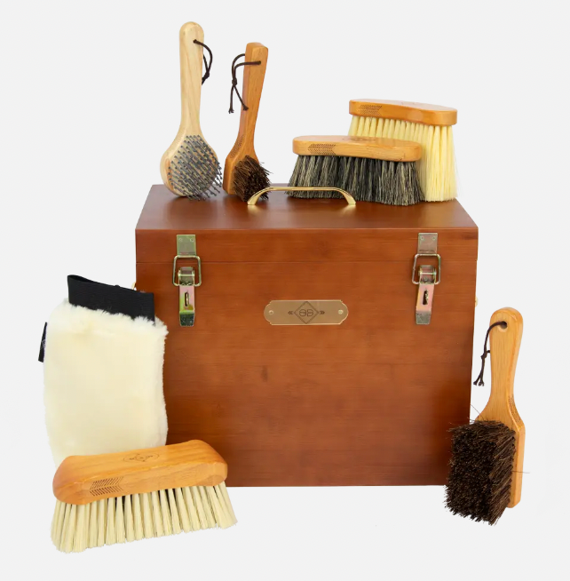 Questo set di Tack Box contiene: spazzola media lunga, spazzola per il corpo media morbida, spazzola media dura, guanto da toelettatura in pelle di pecora, spazzola per criniera, spazzola per zoccoli, nettapiedi.