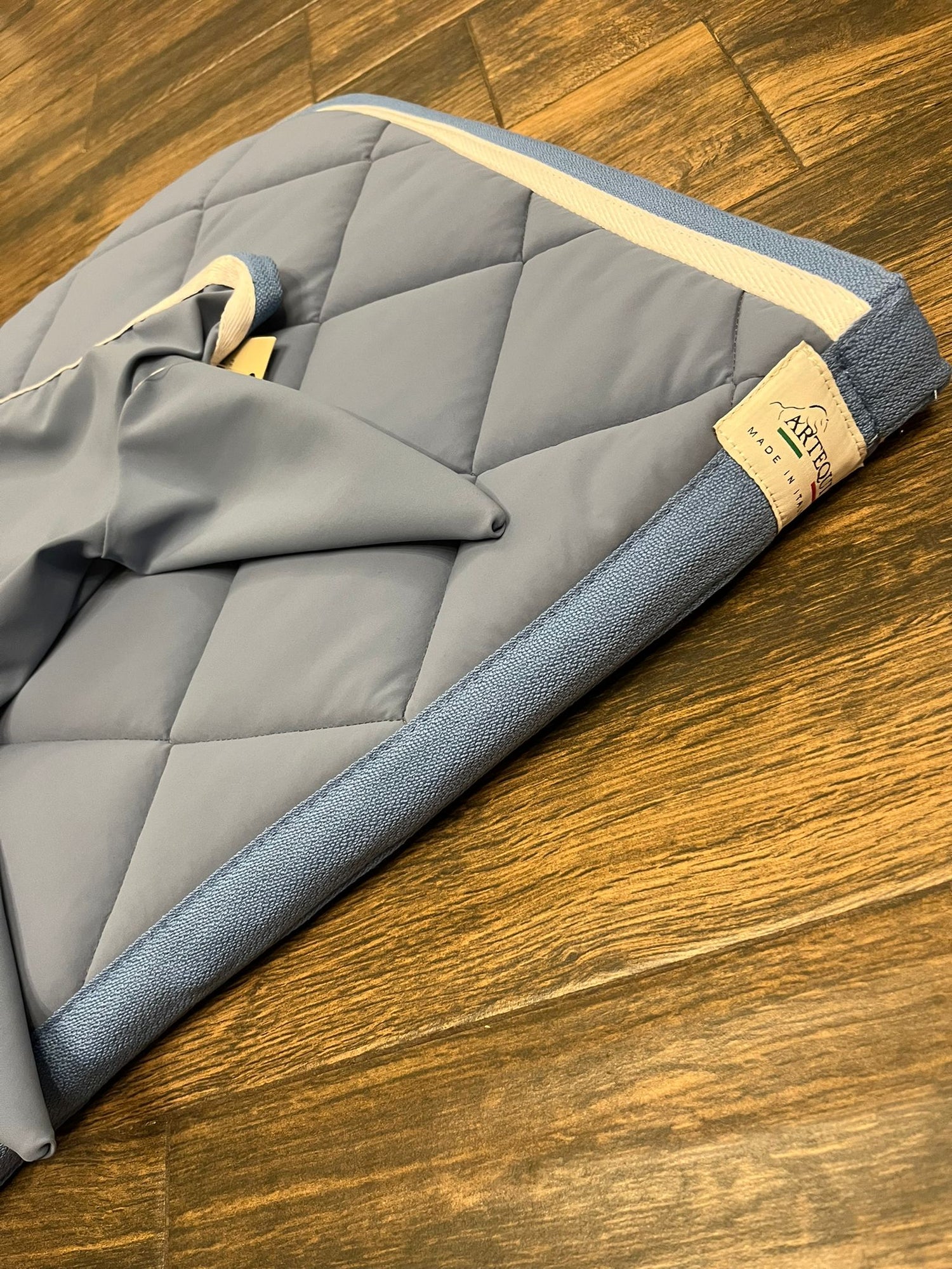 Completo Artequi sottosella e cuffia in tessuto tecnico celeste con bordo bianco.