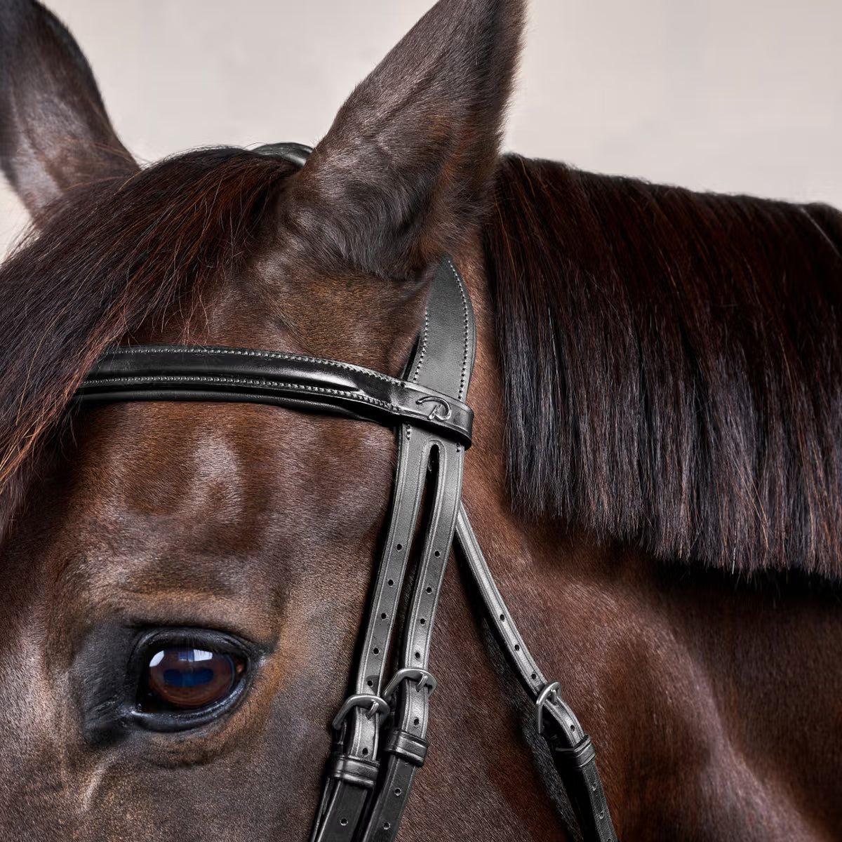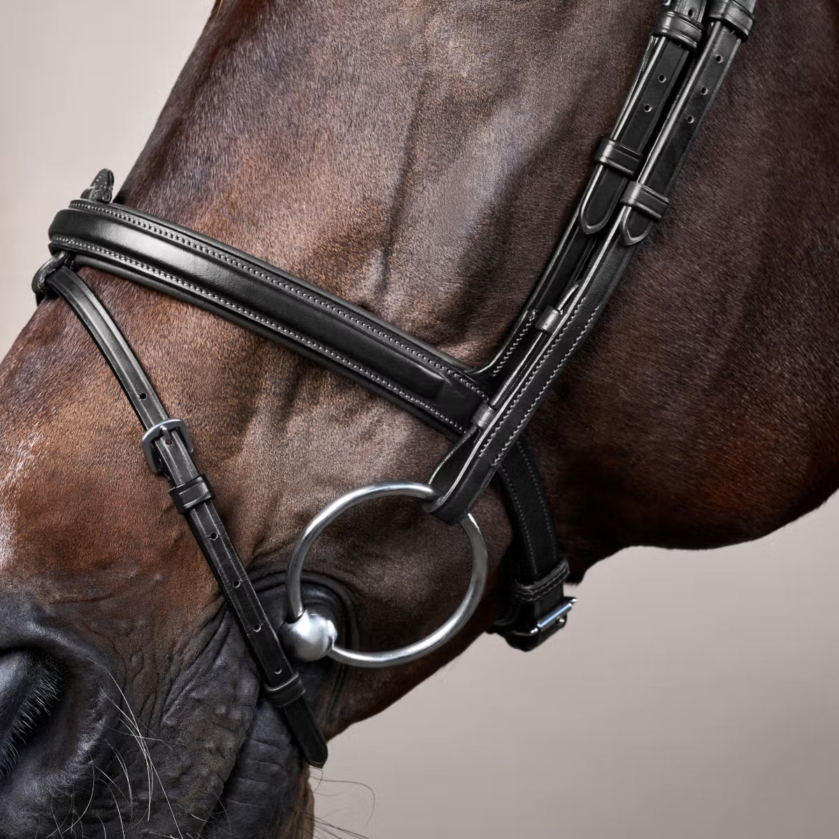 Fine La briglia fa parte della collezione New English, il che significa che il colore delle cuciture è abbinato al colore della briglia. Le fibbie sono in acciaio inossidabile. Disponibile nei colori marrone e nero.
