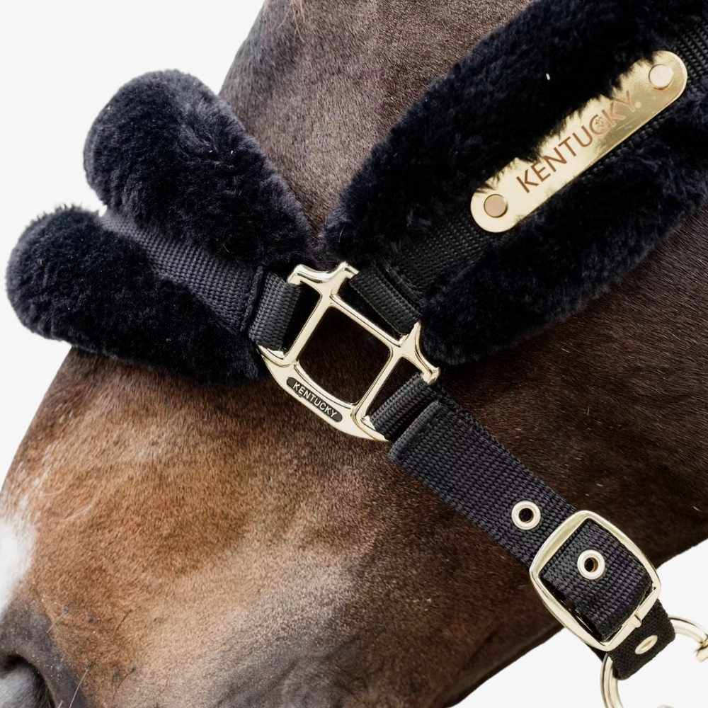 La cavezza è realizzata in nylon. Sul naso, dietro le orecchie e sulle guance, la pelle di pecora artificiale è cucita sul nylon. La cavezza presenta una piastra color oro con il nostro logo inciso. Questa piastra può essere girata e incisa con il nome del tuo cavallo. Tutte le fibbie sono color oro e quindi si abbinano perfettamente ai nostri guinzagli.
