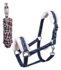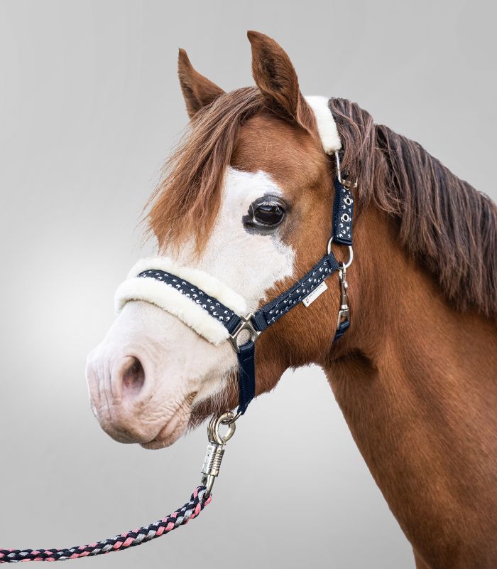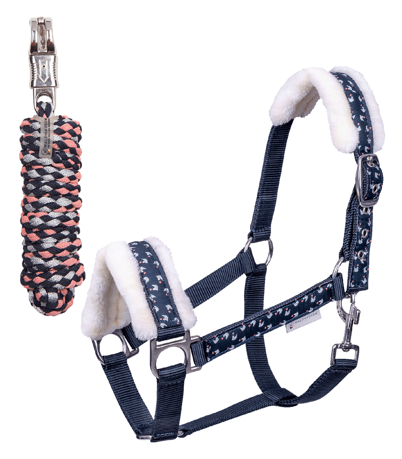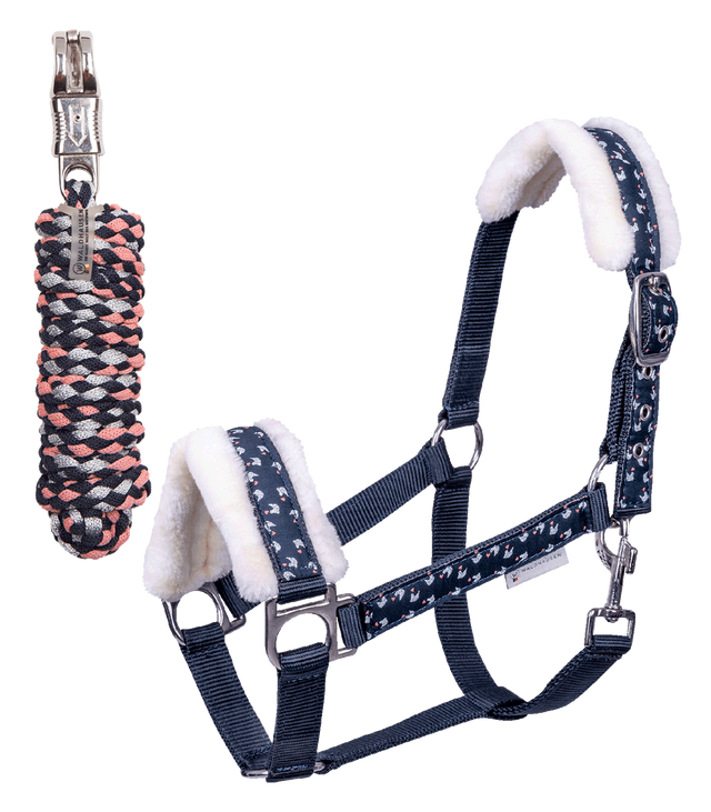 Set composto da capezza in deliziosa stampa all-over e lunghina tricolore. Capezza con ecopelliccia a livello di capezzina e sovracapo. Facile da regolare sulla nuca.