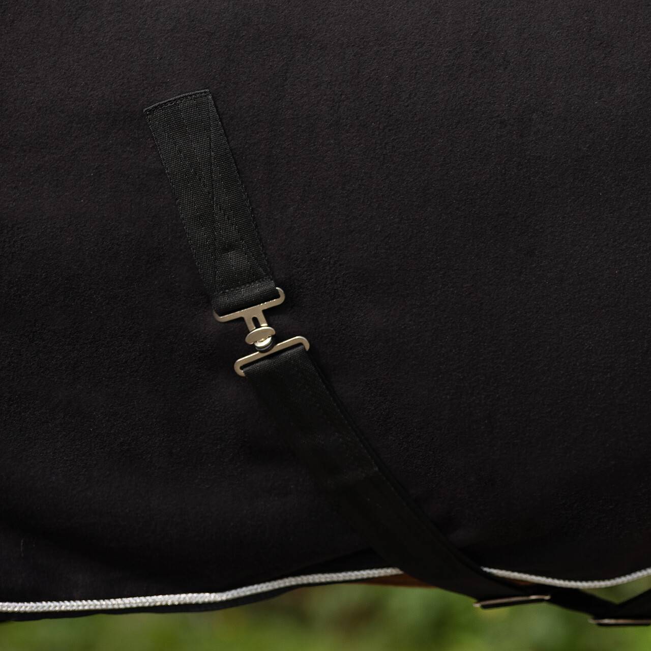 Dopo aver dissellato il cavallo, usate una coperta in pile per evitare che si raffreddi troppo in fretta. Questa coperta è dotata di sopraccinghie rimovibili. Le chiusure anteriori sono coperte da una patta fissata con chiusure a strappo. Il cordino e l'ornamento argentati conferiscono alla coperta un aspetto chic.