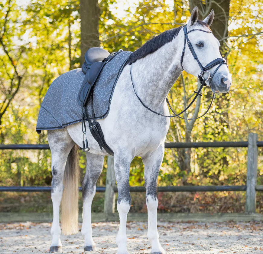 Questa coperta foderata in pile può essere utilizzata durante il riscaldamento e il defaticamento del cavallo. Questa coperta da allenamento alla moda fa parte della collezione invernale ed è disponibile in diverse stampe. La coperta si fissa al garrese con una chiusura a strappo.