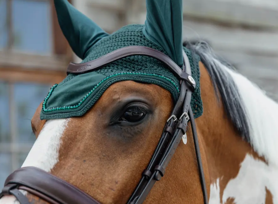 Il velo anti-mosche in velluto con perle è un vero colpo d'occhio e protegge le orecchie del cavallo allo stesso tempo. Il velo anti-mosche si abbina al sottosella e alle bende in velluto con perle.