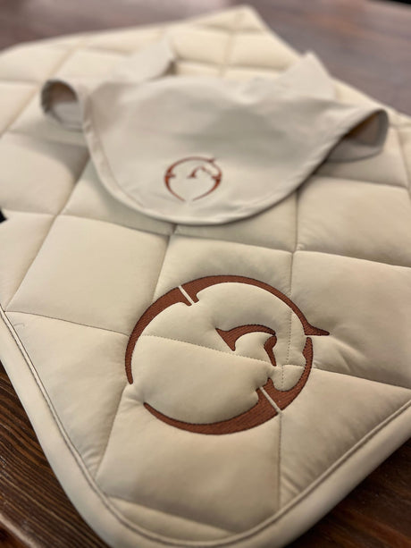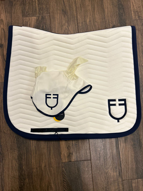 In esaurimento (1 unità)€130,00€145,00Prezzo unitario /Non disponibileSottosella e Cuffia Equestro Dressage crema con bordo blu