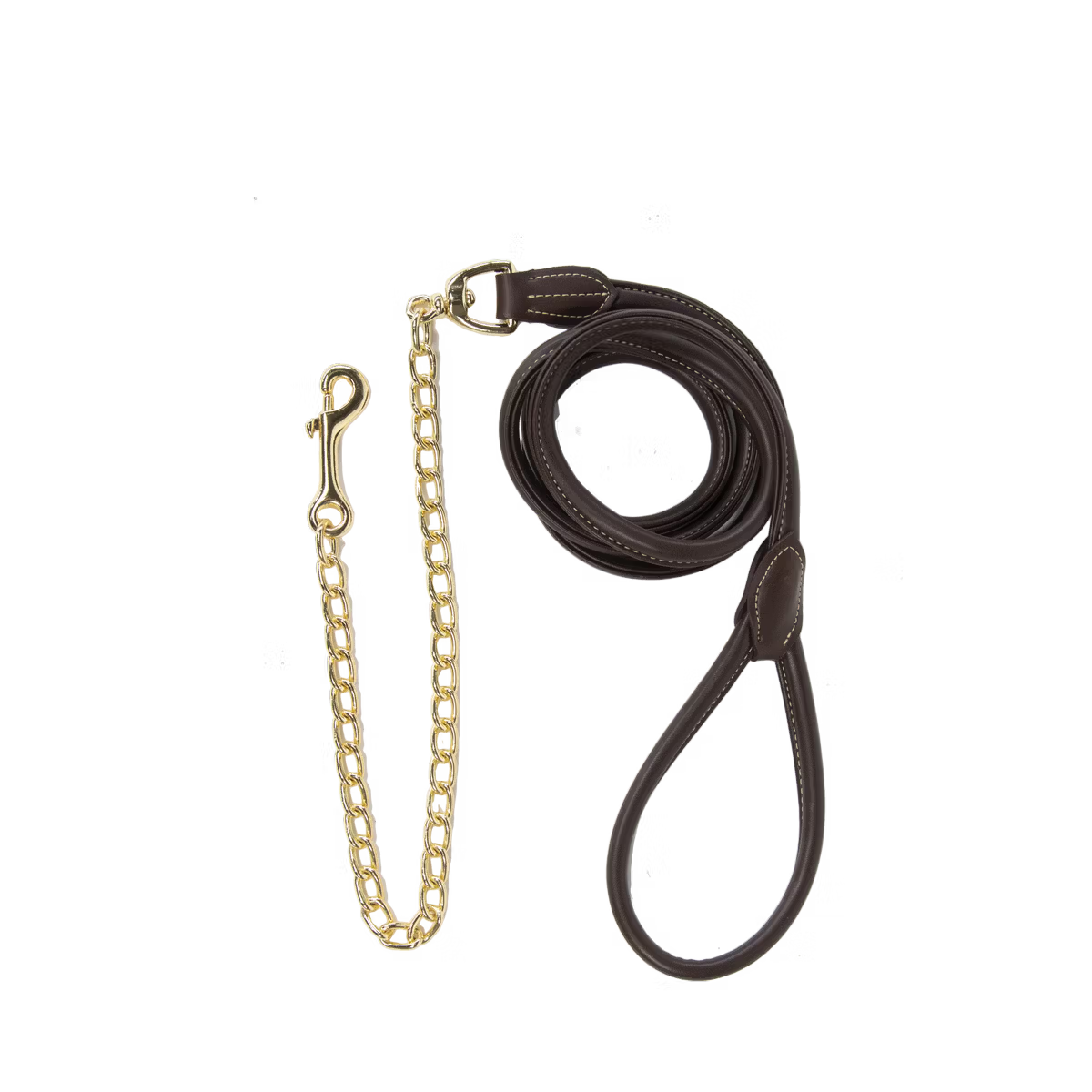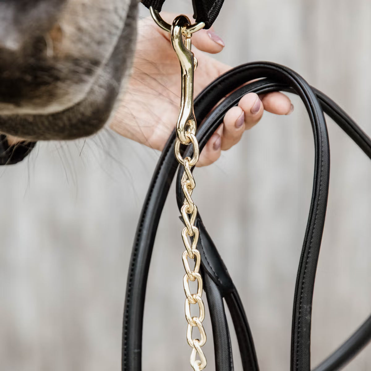 Questo guinzaglio a catena in pelle è perfetto per presentare il tuo cavallo o per l'uso quotidiano, poiché il materiale è molto pratico. La catena in ottone dorato può essere utilizzata per un maggiore controllo.