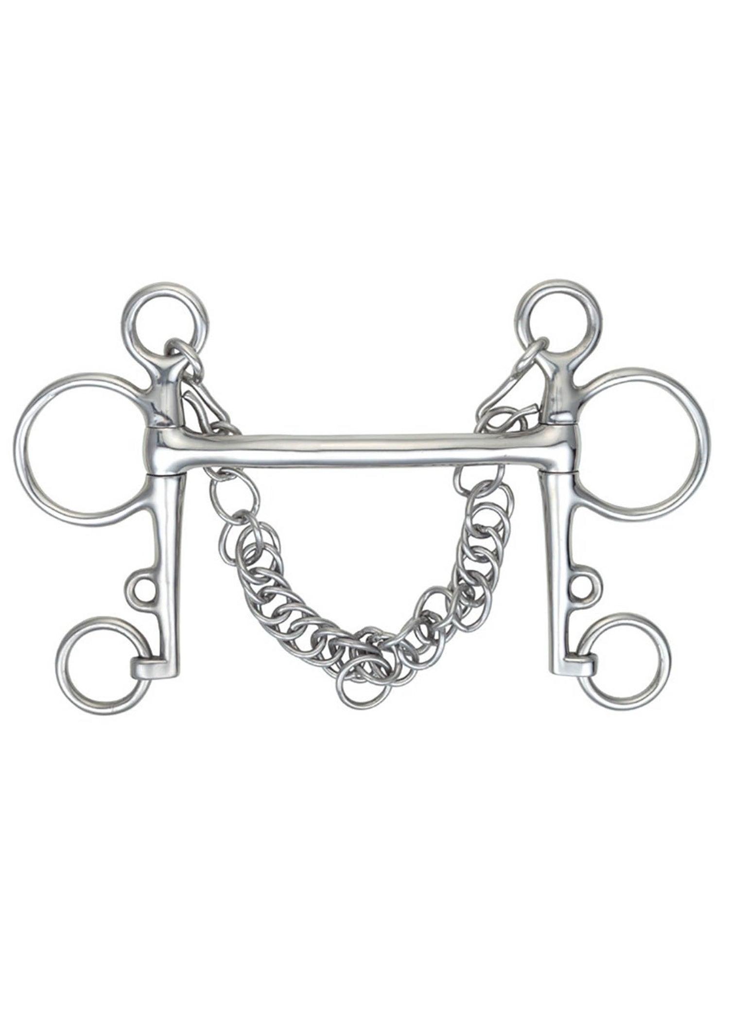 La pressione è distribuita uniformemente attraverso la bocca. Ideale per cavalli con bocche piccole o morbide. Può essere utilizzato con redini doppie o arrotondamenti pelham. Spessore14 mm. Altezza: 130 mm (5", 5,5 ").