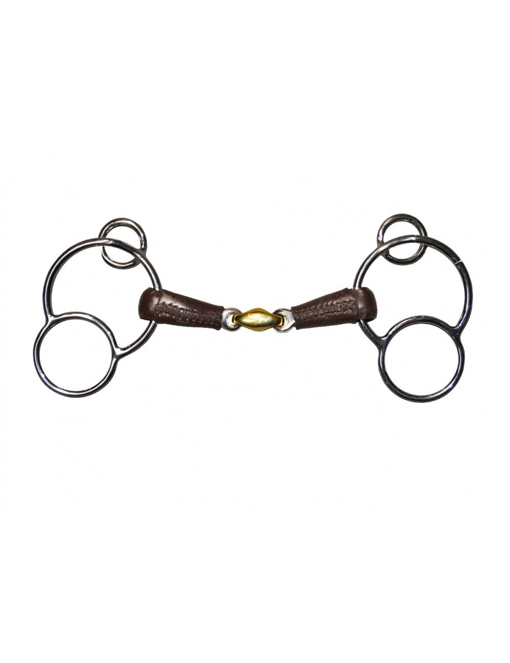 Suggerimenti : questo morso può essere utilizzato con le redini fissate sull'anello inferiore, con i passanti o con due paia di redini. Il cannone è rivestito in pelle per evitare un contatto troppo freddo nella bocca del cavallo e per offrire maggiore comfort.