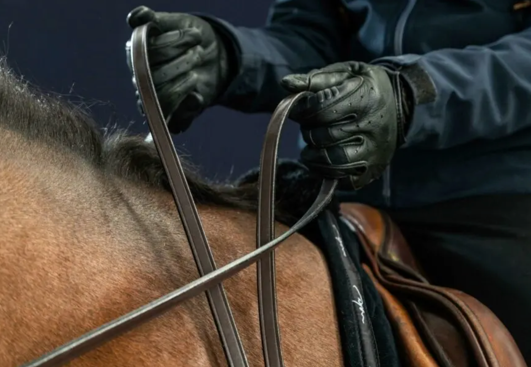 1/2 Redini doppie in cuoio pieno con tutte le briglie e le briglie doppie della New English Collection e della collezione Dressage in cuoio piatto.