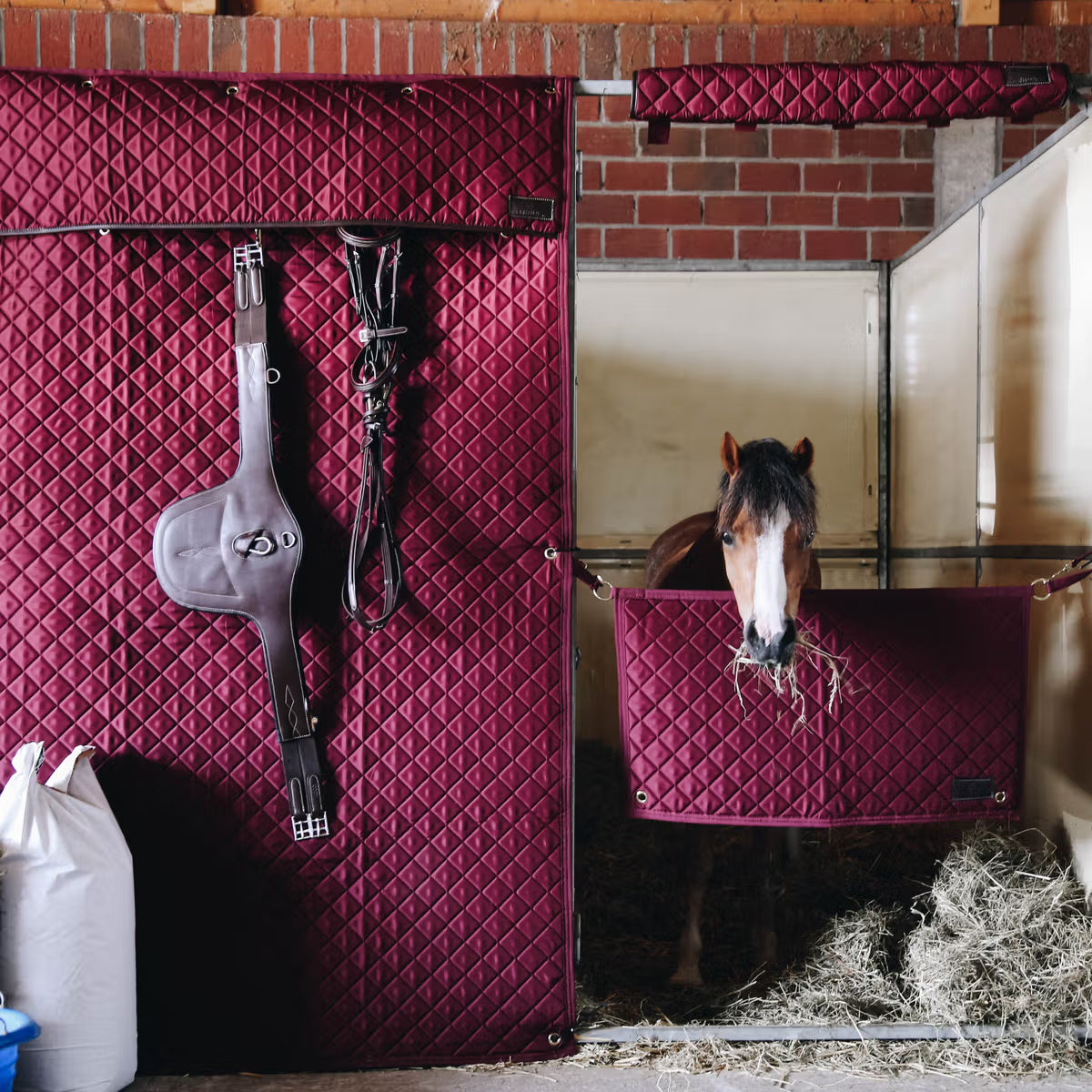 Il copricapo Kentucky Horsewear è la protezione ideale per la testa del tuo cavallo mentre si trova nella stalla. Il copricapo deve essere fissato al palo superiore del telaio della porta della stalla con l'aiuto di cinque robuste chiusure in velcro. Il copricapo è realizzato in poliestere 600D ad alta tenacità e ha un aspetto elegante grazie alla trapuntatura a rombi, al profilo in similpelle marrone e al logo Kentucky in similpelle. Questo copricapo si abbina perfettamente alla nostra tenda da stalla e alla nostra protezione da stalla. È lavabile in lavatrice a 30°, non adatto all'asciugatrice.