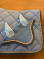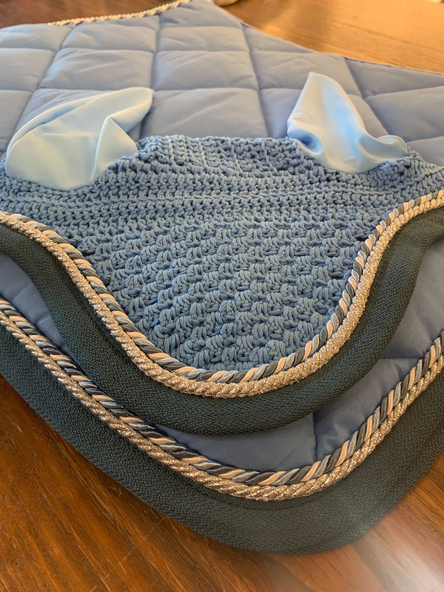 Completo Artequi azzurro con bordo verde petrolio , cordino argento brillantinato e doppio cordino bianco, azzurro e verde petrolio.