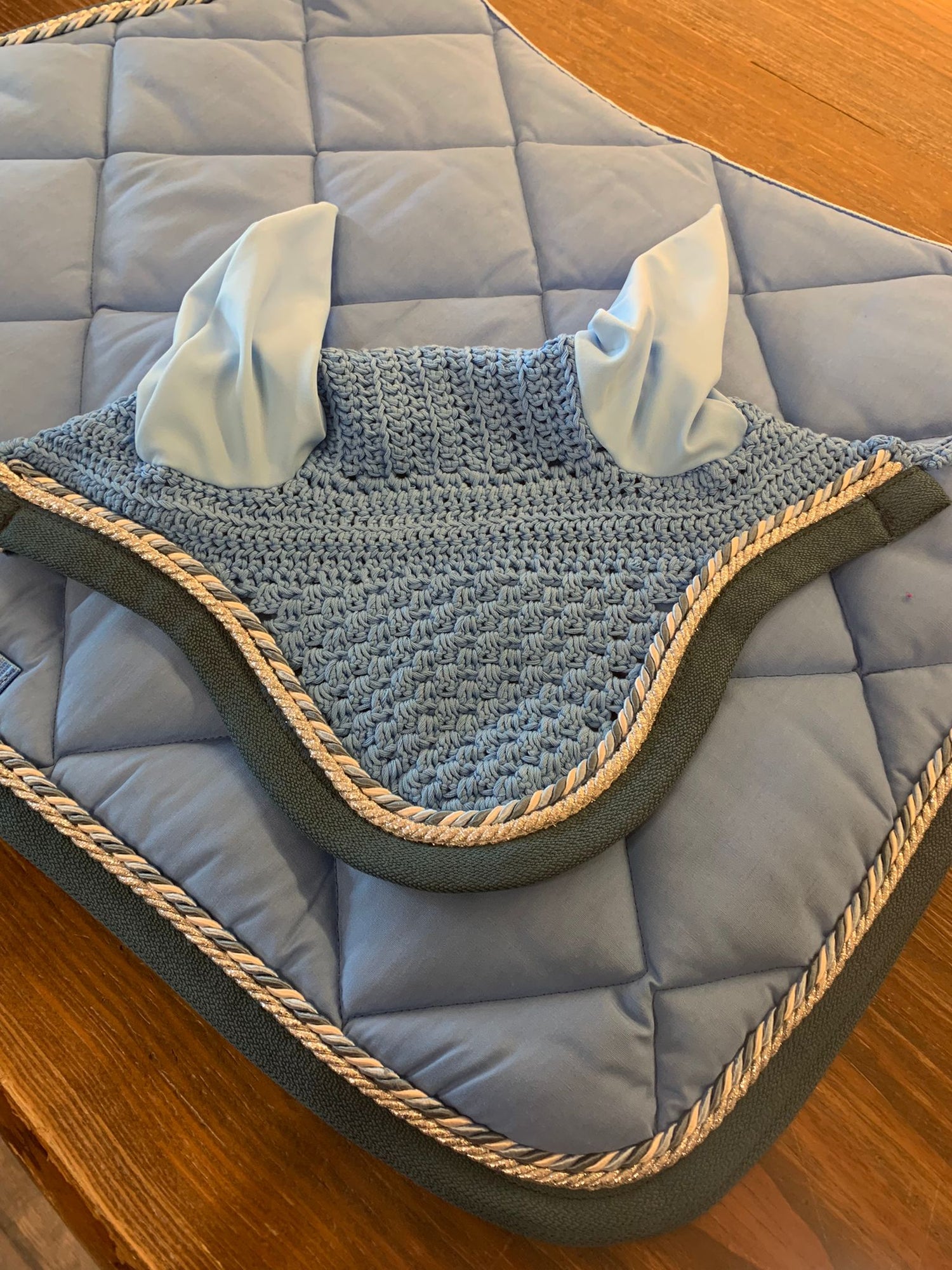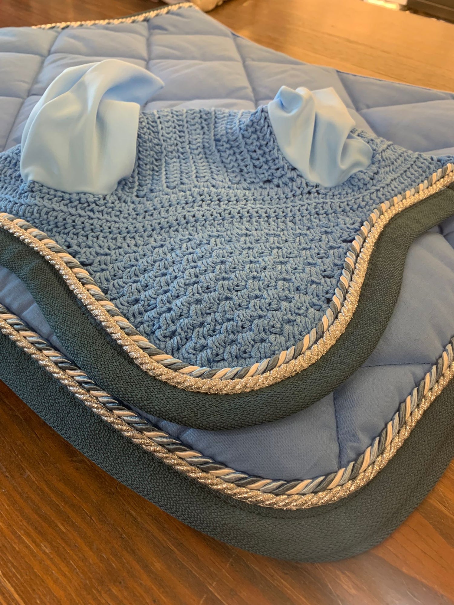 Completo Artequi azzurro con bordo verde petrolio , cordino argento brillantinato e doppio cordino bianco, azzurro e verde petrolio con cuffia abbinata