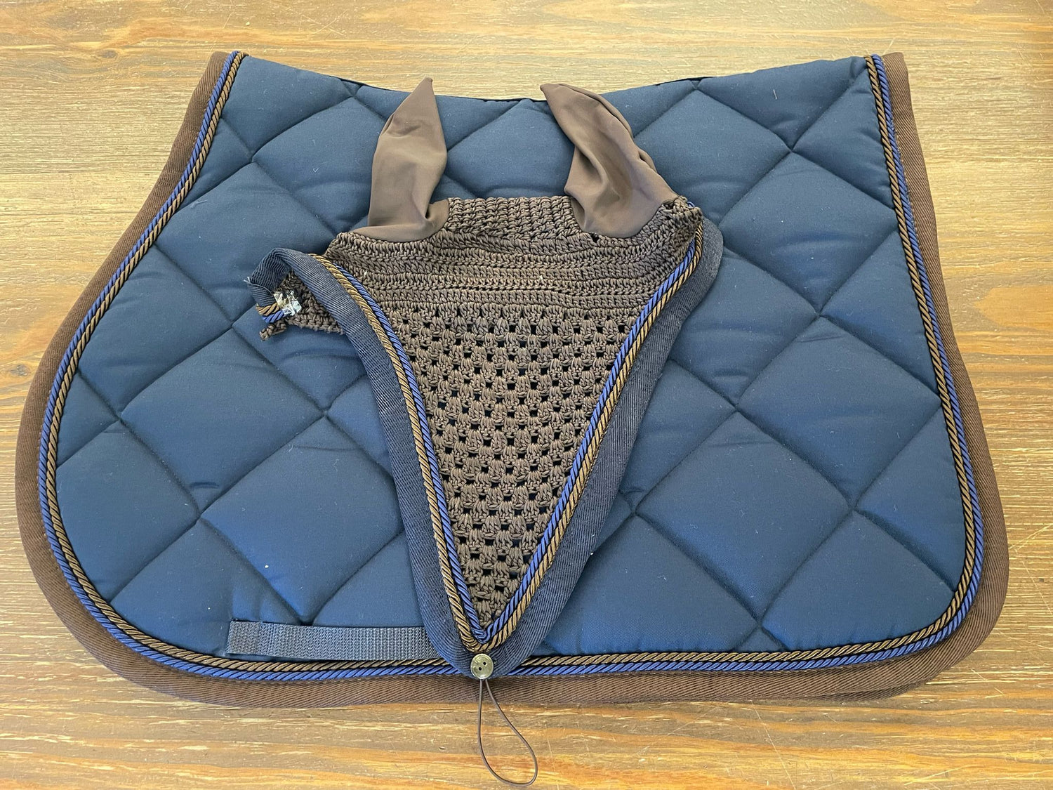Cuffia lunga base marrone con bordo blue doppio cordino abbinata al sottosella.