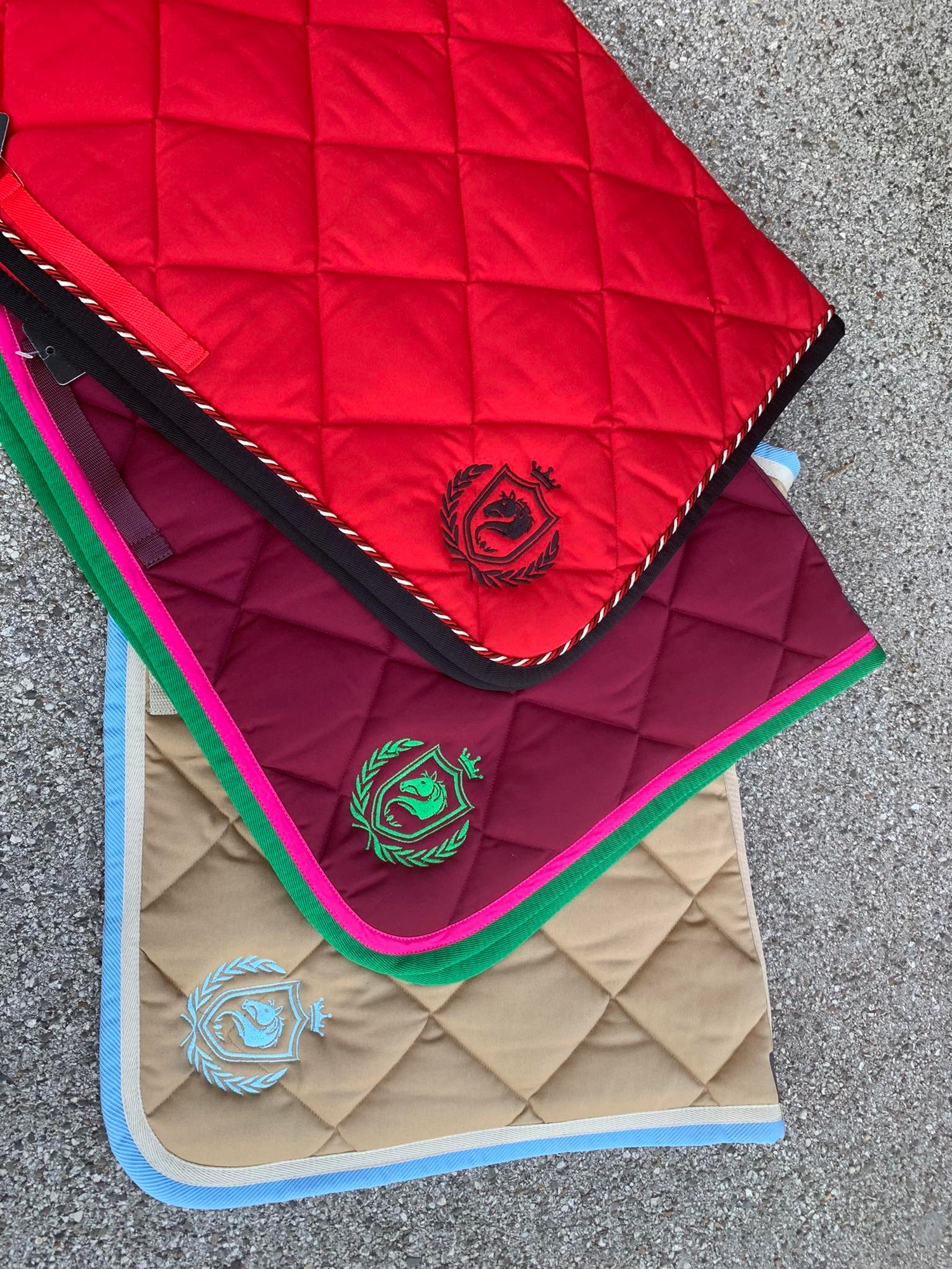 Sottosella da salto Artequi con logo Sellarium, bordeaux con bordo fucsia e verde.