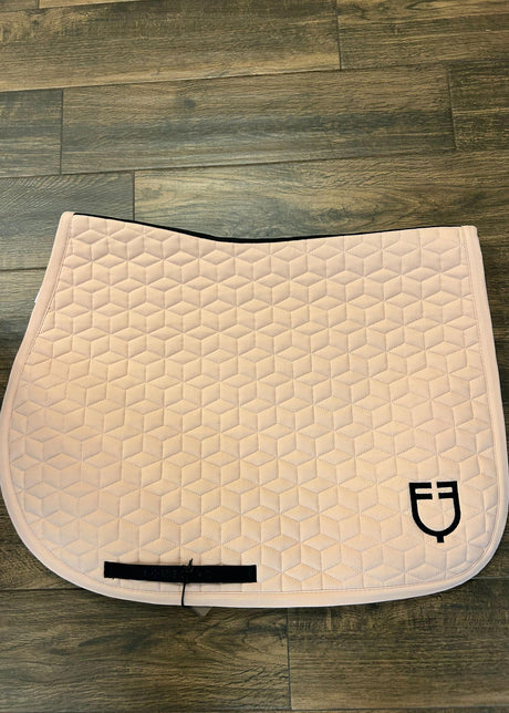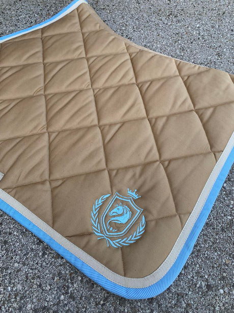 Sottosella da salto Artequi con logo Sellarium beige con bordo celeste e beige rigato