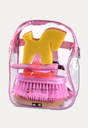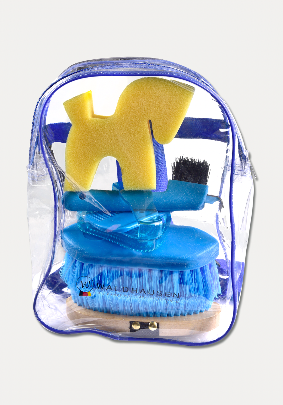 Set per la pulizia per grandi e piccini, amanti dei cavalli. Brusca, bruscone, pettine per criniera, curasnetta, striglia a forma di cuore e spugnetta a forma di cavallino in un pratico zainetto trasparente.