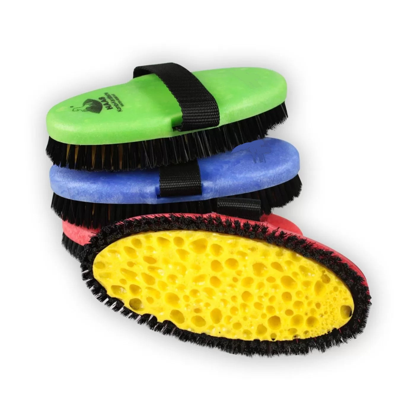 Caratteristiche: due anelli di setola sintetica con al centro la spugna, ideale per lavare e spazzolare contemporaneamente il vostro cavallo. Dorso in plastica con logo "Sellarium" e logo "Haas". Passamano in nylon.