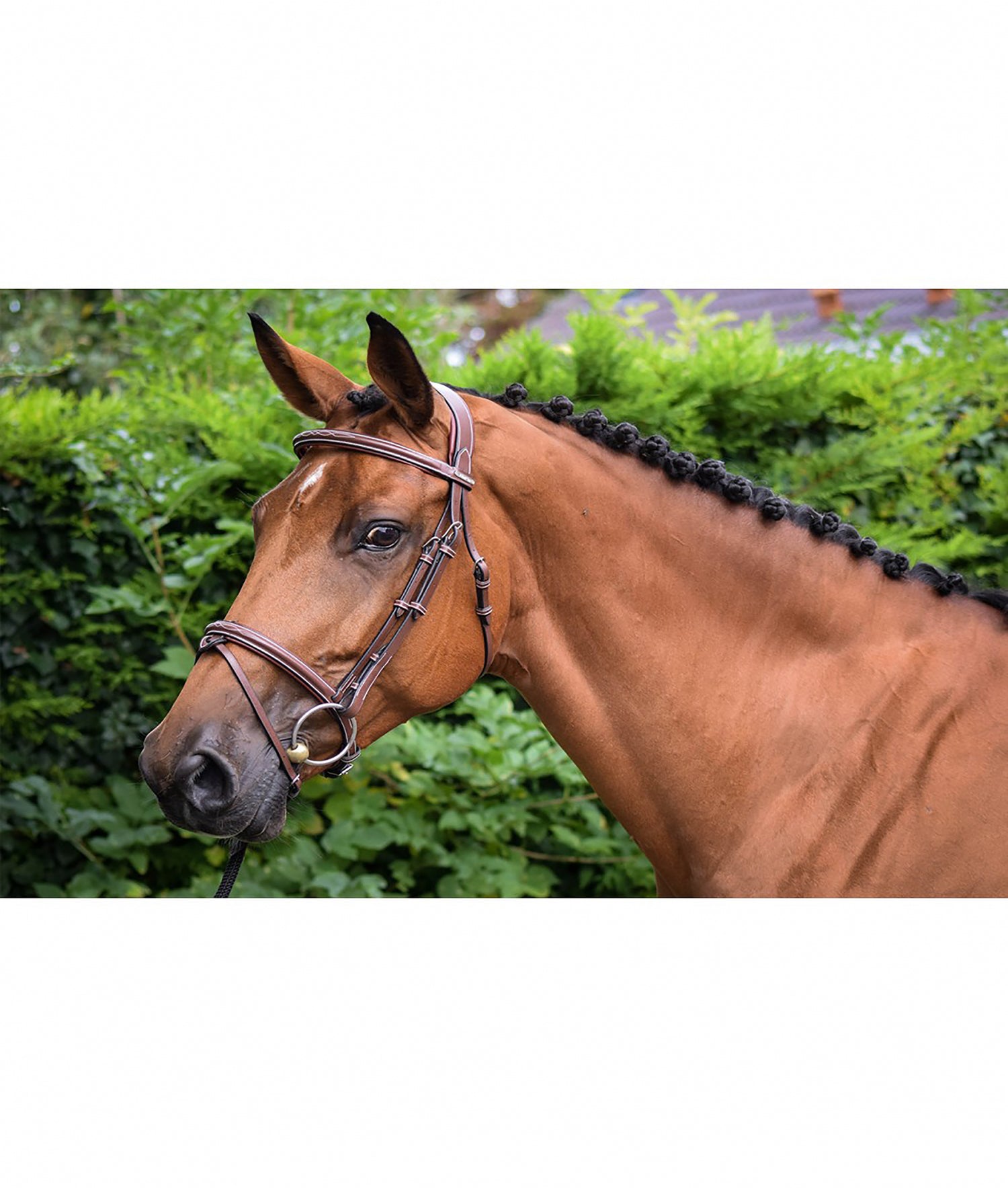 Dalla collezione One , la briglia Paris è un prodotto essenziale , una base senza tempo . Il frontalino e capezzina sono realizzati curvo pelle e sono arricchite con un contrasto crema fantasia . Un nasello è attaccato al nasello . Il poggiatesta è leggermente anatomico per offrire maggiore comfort al cavallo .