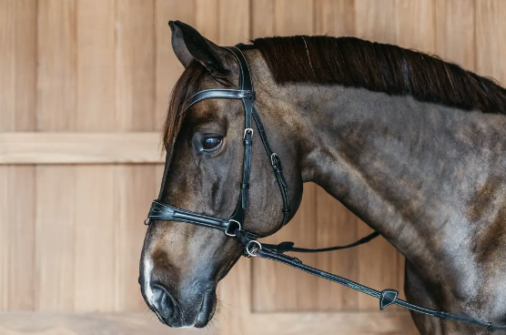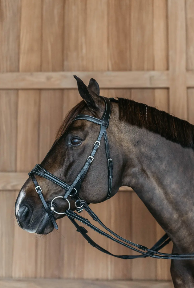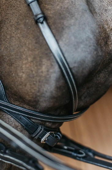 La briglia ha un flash rimovibile da ½'' e include due cinghie di trazione incrociate, che la rendono regolabile in base alle tue esigenze e consentono cinque diversi modi di utilizzarla. Per ottimizzare il campo visivo del tuo cavallo, i montanti sono posizionati sotto il livello degli occhi.