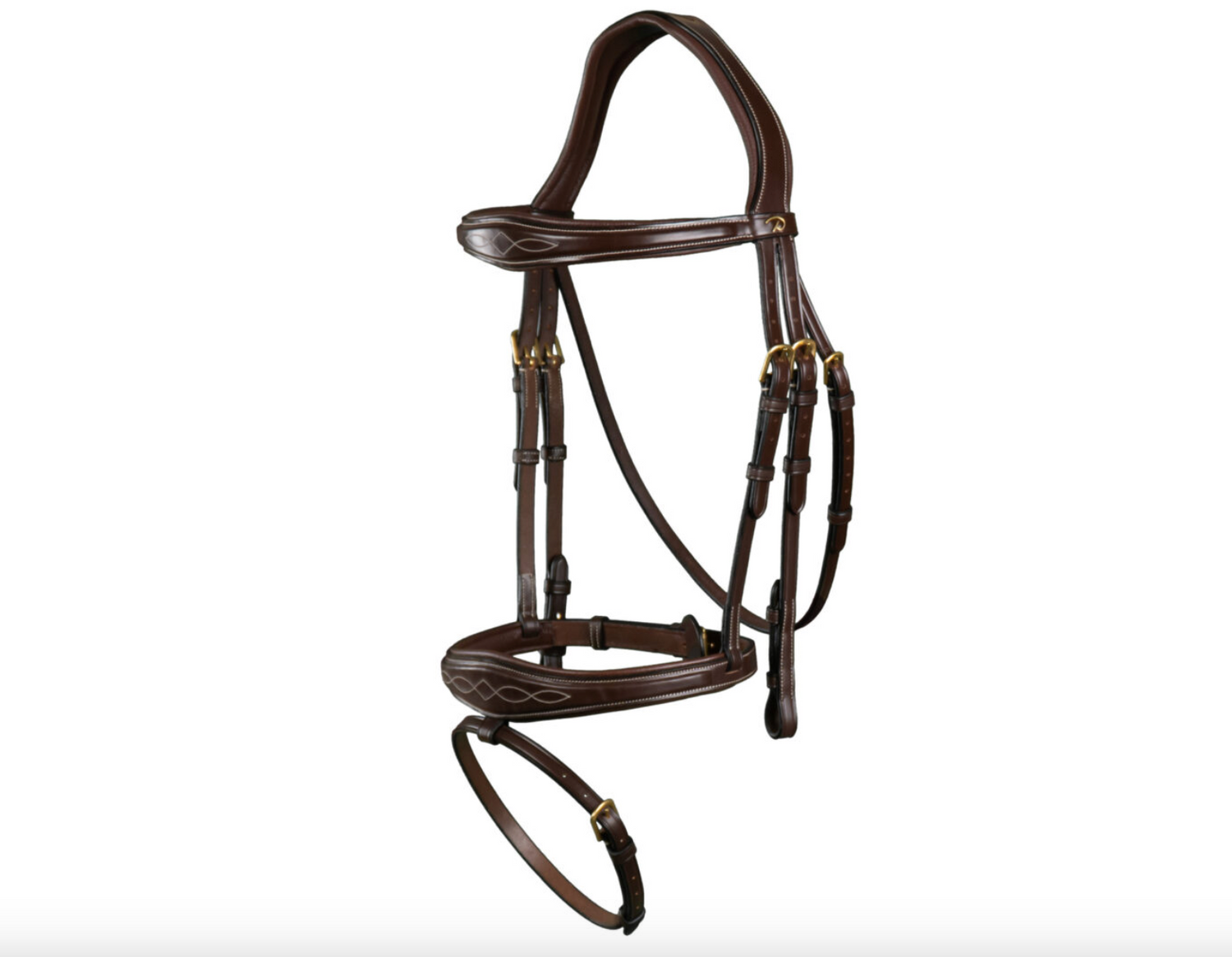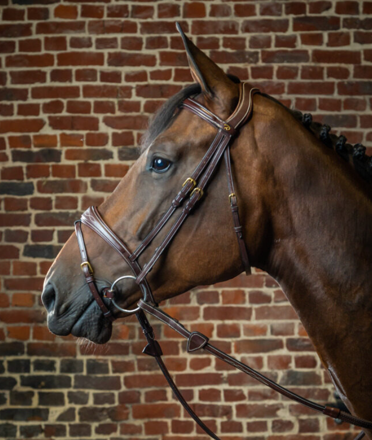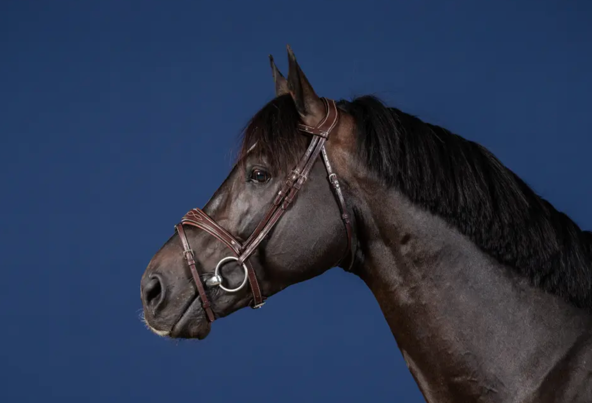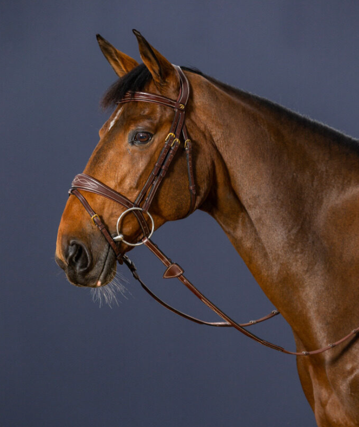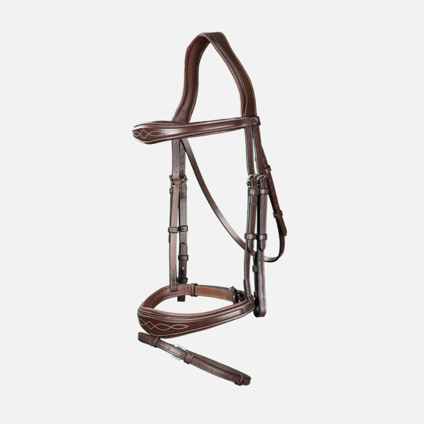 Testiera Dy'On marrone anatomica con frontalino e capezzina allargati al centro e ricamati
