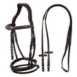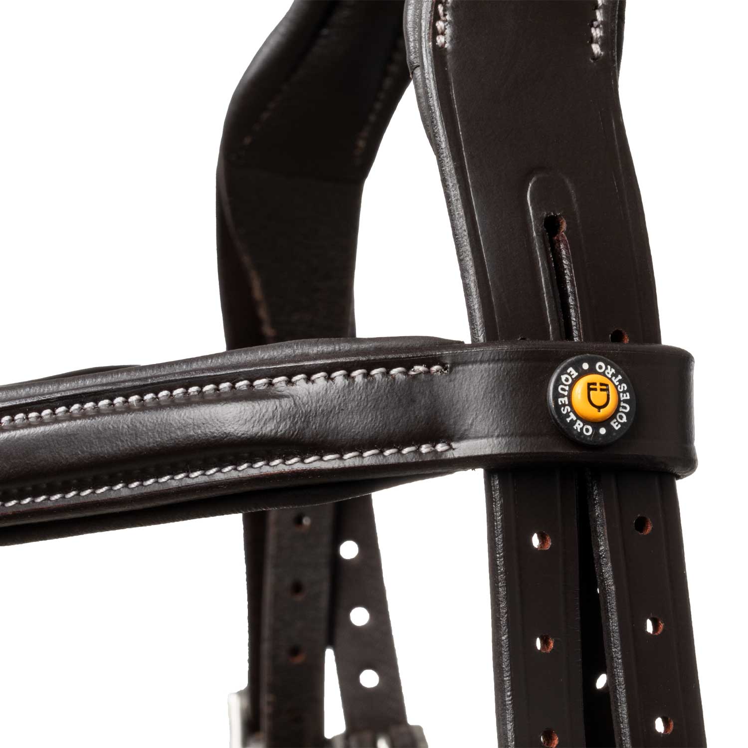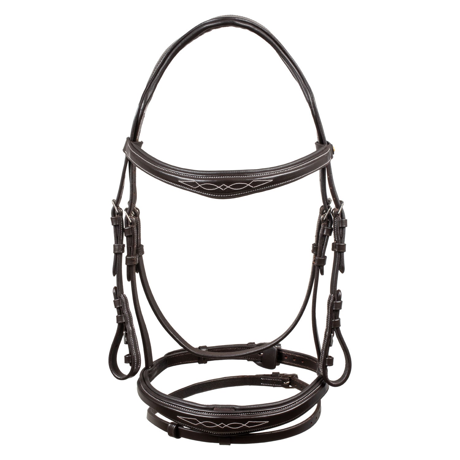 Testiera inglese realizzata con pregiato cuoio morbido, caratterizzata da fibbie in acciaio inossidabile che assicurano durabilità e stabilità nel tempo. La capezzina, dotata di chiudibocca regolabile e imbottitura, assicura un comfort ottimale e una vestibilità perfetta. Sia il frontalino che la capezzina sono impreziositi da motivi ricamati. Il design anatomico del sovracapo distribuisce uniformemente la pressione sulla nuca, garantendo il massimo comfort al cavallo. Le redini sono incluse per una completa dotazione.